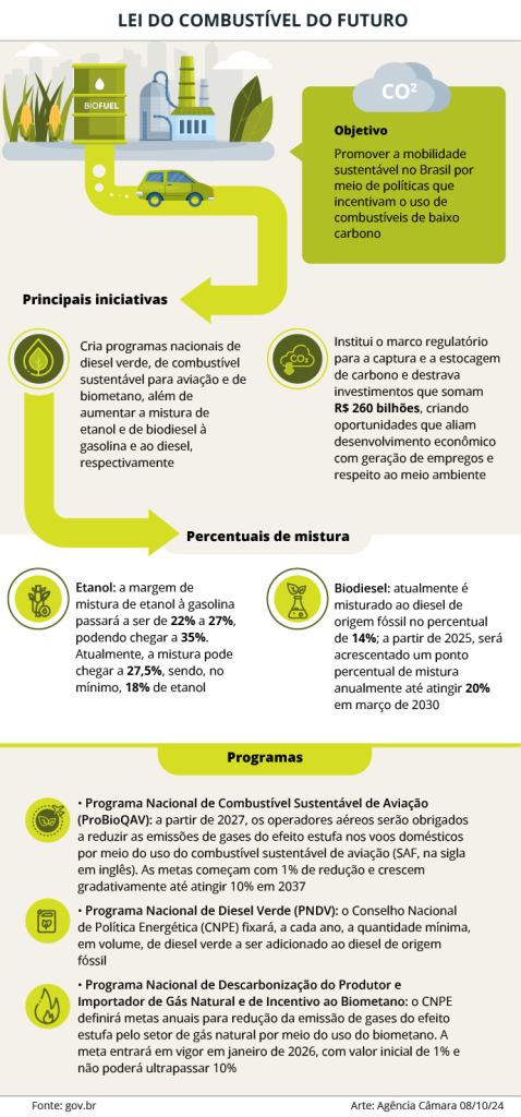 A Lei do Combustível do Futuro (PL 528/2020) estabelece diretrizes para a ampliação do uso de combustíveis renováveis e de baixa emissão de carbono no Brasil.