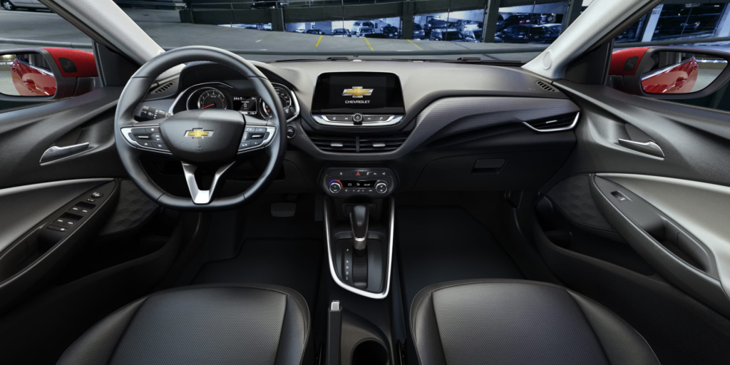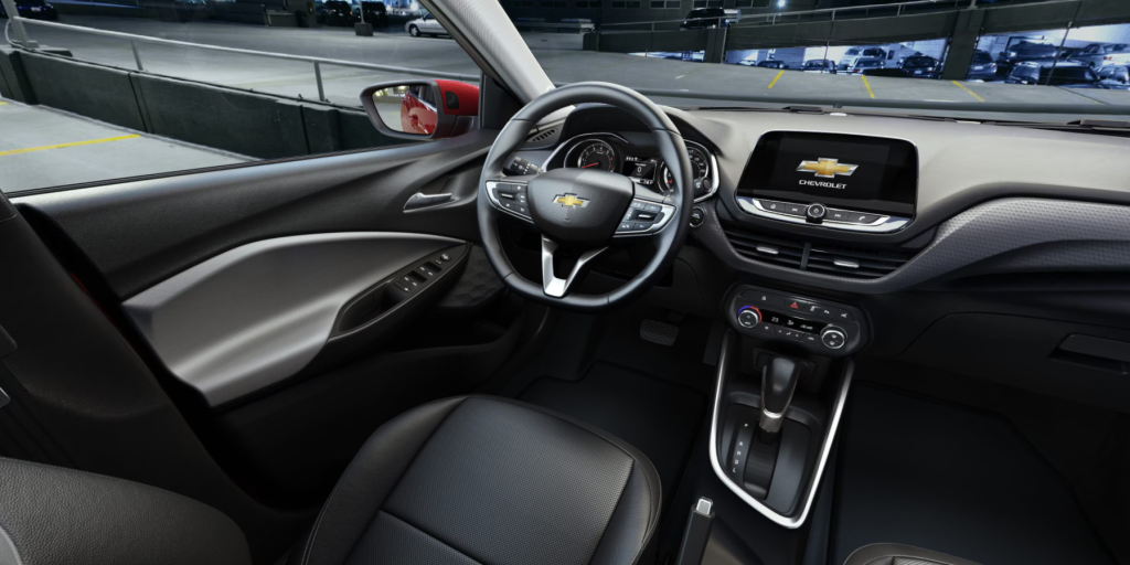 Os detalhes de acabamento também chamam atenção. As molduras do painel, as saídas de ar e o desenho das portas seguem o padrão de qualidade da Chevrolet, com encaixes precisos e materiais de boa aparência.