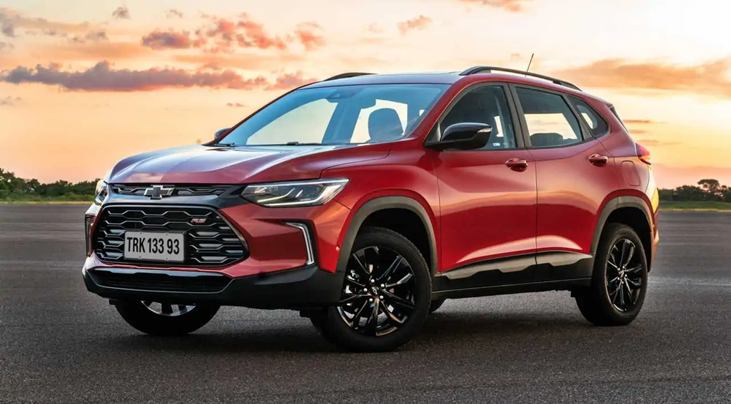 No Tracker RS, a proposta segue a mesma linha. O SUV ganha identidade visual mais agressiva, com elementos escuros e rodas específicas.